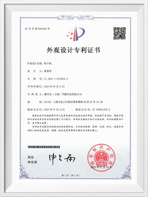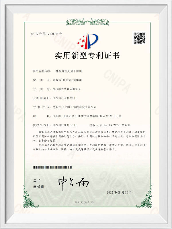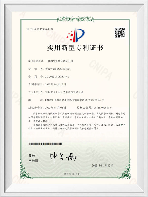 Et null luftforbrukskomprimeringsvarme som absorberer tørketrommel - Patent Certificate
