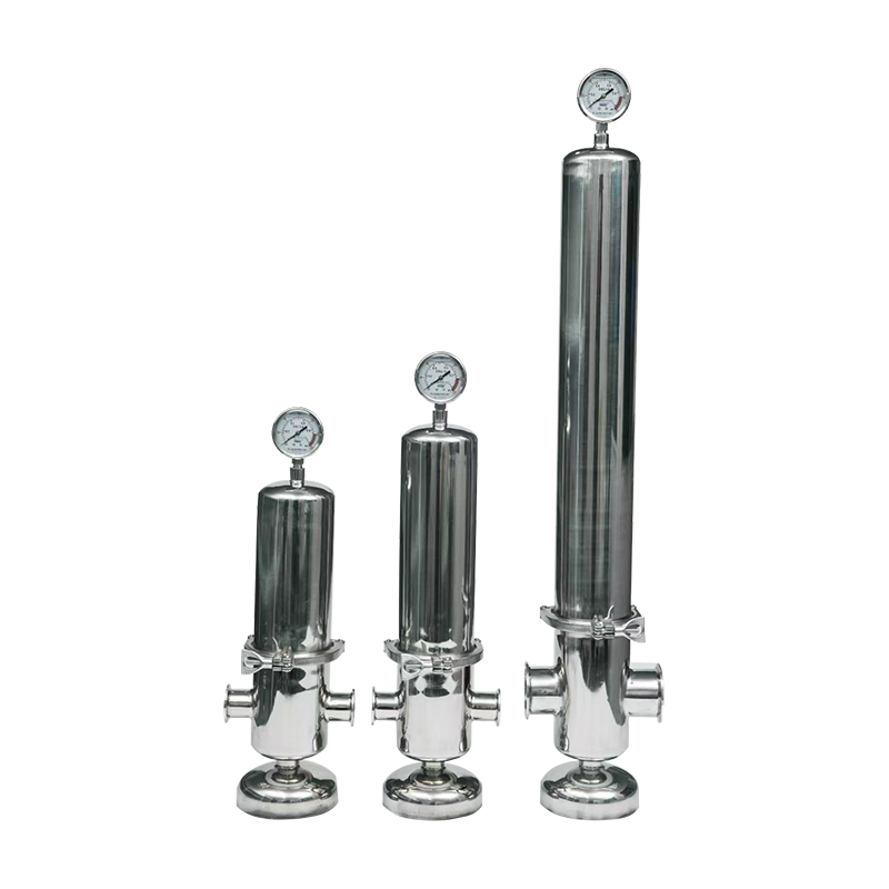 Steriliseringsfilteret vedtar hovedsakelig et mikrofiltreringsfilterelement med et stort spesifikt overflateareal og en filtreringsnøyaktighet på 0,1 og 0,22um eller over. Det brukes hovedsakelig for å forhindre urenheter og skadelige bakterier i luften, produksjonslinjene og sterile rom fra å forårsake endringer i vannkvalitet, produkter og sterile rommiljøer, som oppfyller de industrielle behovene til mat, biokjemi, drikke, øl, medisin, elektronikk og andre næringer.